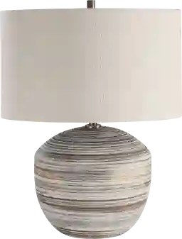The drum shape and linen material are designed to diffuse light evenly across a room. Because linen is a natural fiber with slight slubbing, it creates a warm, textured glow rather than a harsh, direct beam. For a cozy evening atmosphere, we recommend pairing it with a "Warm White" LED bulb (2700K-3000K), which highlights the earthy tones of the striped base.