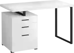 Maximize your home office space and your productivity with this Calavetti computer desk with 3 storage drawers. The thick-panel floating desktop provides room for the essentials you need to work and allows you to use the top of the drawer unit as an extra surface. Finished in the same white laminate as the desktop, the drawer unit includes 2 small drawers and 1 large drawer with a bar for hanging files and offers space for items you want to keep off the work surface. The drawer unit is reversible and can be installed on the left or right side according to your preference. Supporting the desk is a metal leg in a black finish with a modern, stylish U shape. Customer assembly is required.