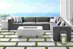The good times get even better with the Calay sectional's versatile style and endless reconfigurability. This modular outdoor seating set from Cindy Crawford Home features denim-colored slipcovers in UV-resistant, solution dyed Sunbrella fabric. Each seat frame has attached seat and back cushions, water-repellant upholstery and an individual cover, enabling every piece to be used separately or repositioned and connected as desired. Family cookouts, intimate get togethers and everyday relaxation are incredible every time when the seating arrangement you want is always at your fingertips. This set includes three corner wedges, three armless chairs and matching slipcovers. To clean Sunbrella fabric cushions remove dirt and spray on cleaning solution (water and mild soap), then use a soft bristle brush or sponge. Allow cleaning solution to soak into fabric and rinse thoroughly until soap residue is removed. Air dry. Do not dry clean.