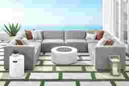 The good times get even better with the Calay sectional's versatile style and endless reconfigurability. This modular outdoor seating set from Cindy Crawford Home features ash-colored slipcovers in UV-resistant, solution dyed Sunbrella fabric. Each seat frame has attached seat and back cushions, water-repellant upholstery and an individual cover, enabling every piece to be used separately or repositioned and connected as desired. Family cookouts, intimate get togethers and everyday relaxation are incredible every time when the seating arrangement you want is always at your fingertips. This set includes four corner wedges, four armless chairs and matching slipcovers. To clean Sunbrella fabric cushions remove dirt and spray on cleaning solution (water and mild soap), then use a soft bristle brush or sponge. Allow cleaning solution to soak into fabric and rinse thoroughly until soap residue is removed. Air dry. Do not dry clean.