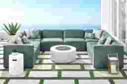 The good times get even better with the Calay sectional's versatile style and endless reconfigurability. This modular outdoor seating set from Cindy Crawford Home features teal slipcovers in UV-resistant, solution dyed Sunbrella fabric. Each seat frame has attached seat and back cushions, water-repellant upholstery and an individual cover, enabling every piece to be used separately or repositioned and connected as desired. Family cookouts, intimate get togethers and everyday relaxation are incredible every time when the seating arrangement you want is always at your fingertips. This set includes four corner wedges, four armless chairs and matching slipcovers. To clean Sunbrella fabric cushions remove dirt and spray on cleaning solution (water and mild soap), then use a soft bristle brush or sponge. Allow cleaning solution to soak into fabric and rinse thoroughly until soap residue is removed. Air dry. Do not dry clean.