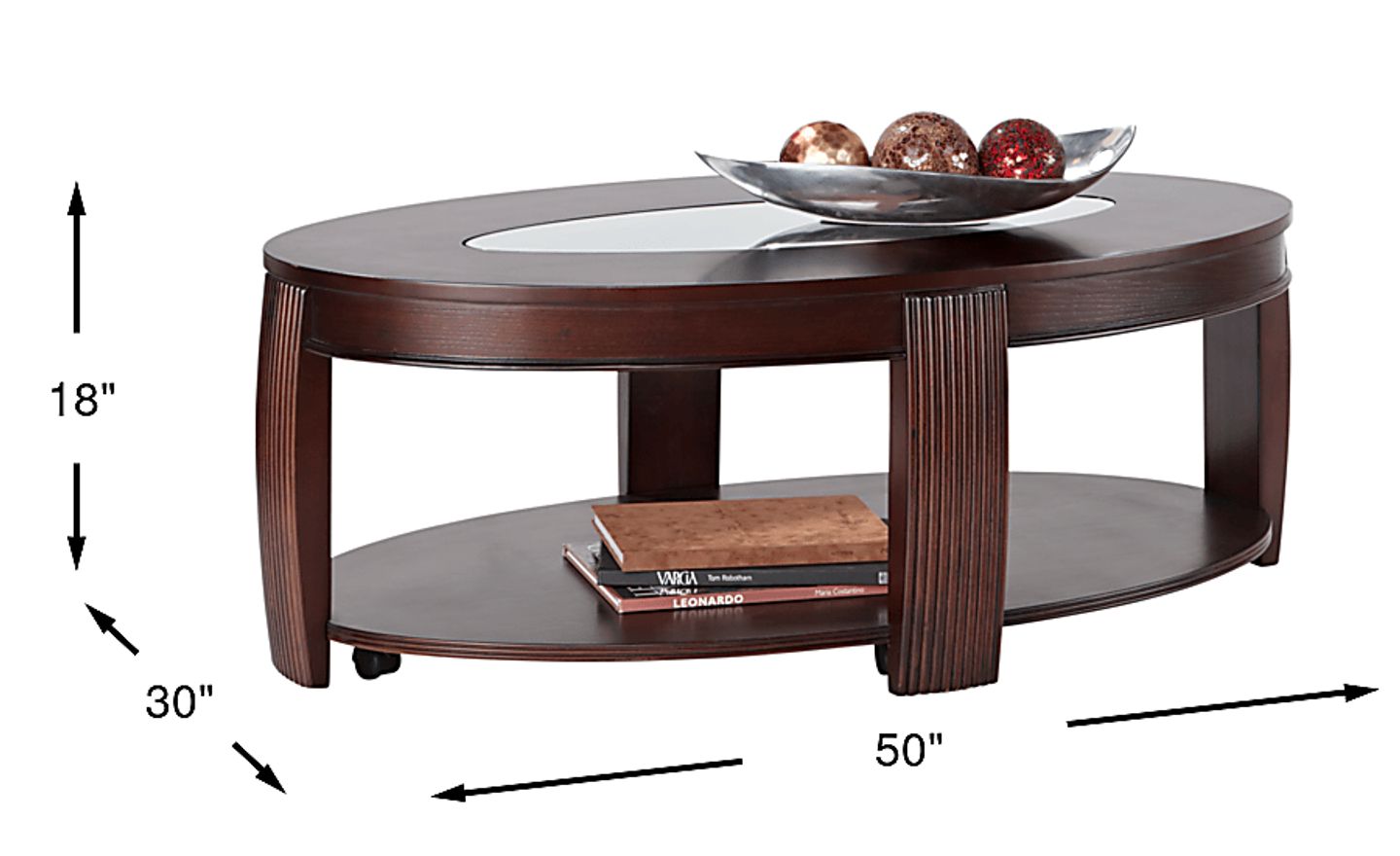 With its stunning transitional design and clever use of materials, the Calcutta cocktail table makes a wonderful addition to your living space. Finely crafted of poplar solids and ash veneers in a dark cherry finish, this oval cocktail table's curved, fluted legs and inset glass panel gives it a unique yet classic look that works well with most any furniture style. Hidden castor wheels make it easy to find just the right spot to place this stylish table.
