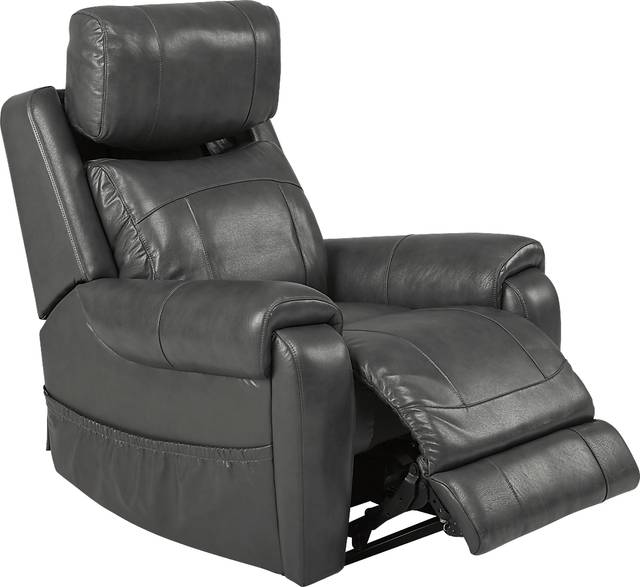 Enjoying the best in modern features, the Calden recliner provides a luxurious look and feel. Its dual power reclining feature allows you to adjust the headrest and chaise-style footrest at the touch of a button. Upholstered in top grain leather where the body touches, this recliner comes in a chic gray color. A heating pad in the lower back cushion helps you relax and unwind, while the lift function delivers superior comfort and support. All features are easily controlled with a handheld remote. Padded roll arms and pub-back seating give it a classic style. Plus, a magazine pouch on the side lets you conveniently tuck away books, remotes and more. Weight limit of 400 lbs. Upholstery: Top grain leather where the body touches and vinyl sides and backs.