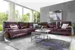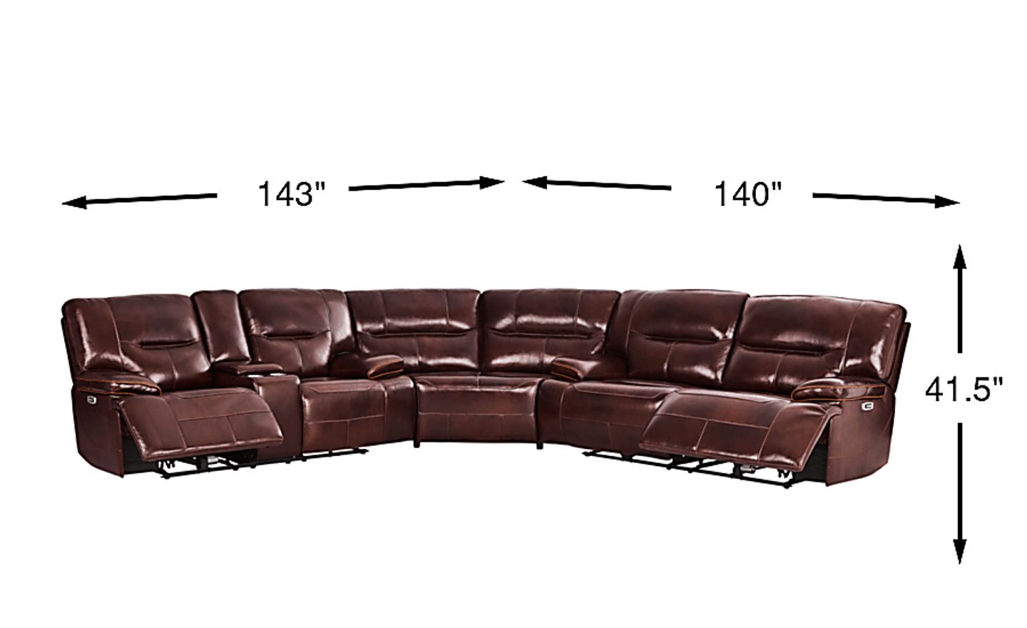 Like a breath of fresh air on a warm spring day, the Caletta Way sectional from Cindy Crawford Home brings a lively ambiance to your family's most lived-in room. Upholstered with luxurious top grain leather where the body touches, this piece is highlighted by pillow pad arms and striking contrast welt details that bring the merlot color of the fabric to life. This total comfort package features dual power reclining relaxation with power adjustable head and footrests that are perfect for all the days that end in Y. The sectional also boasts a center lift-top storage console and a pair of cup holders. You can even charge some of your favorite electronic devices with the convenient USB-A ports while you relax. Upholstery: Top grain leather where the body touches and polyurethane fabric sides and backs. Leather is a durable, low maintenance product, however, general regular maintenance is necessary. To keep your leather clean, vacuum it regularly, removing any dust, and clean it with water and a mild non-detergent soap.