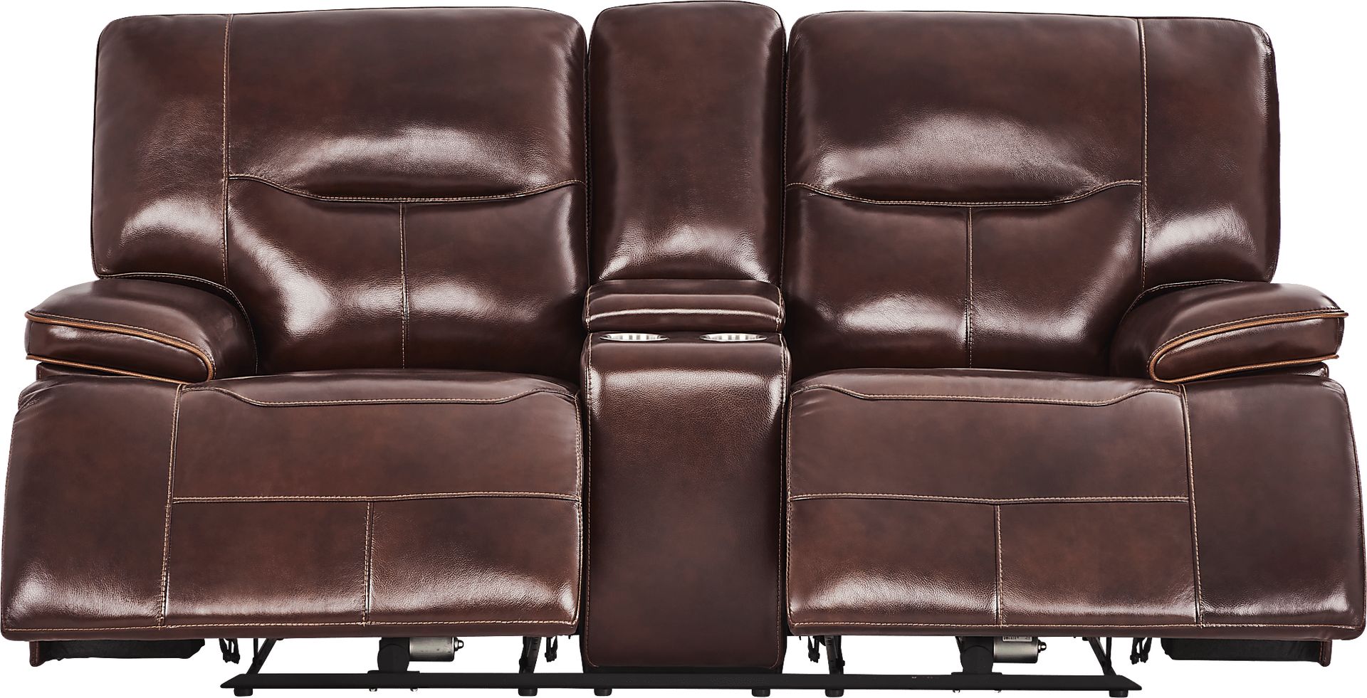 Like a breath of fresh air on a warm spring day, the Caletta Way loveseat from Cindy Crawford Home brings a lively ambiance to your family's most lived-in room. Upholstered with luxurious top grain leather where the body touches, this piece is highlighted by pillow pad arms and striking contrast welt details that bring the merlot color of the fabric to life. Dual power reclining relaxation is the total package with a power adjustable head and footrests that are perfect for all the days that end in Y. You can even charge some of your favorite electronic devices with the convenient USB-A ports while you relax. A center lift-top storage console alongside a pair of cup holders delivers complete convenience. Upholstery: Top grain leather where the body touches and polyurethane fabric sides and backs. Leather is a durable, low maintenance product, however, general regular maintenance is necessary. To keep your leather clean, vacuum it regularly, removing any dust, and clean it with water and a mild non-detergent soap.