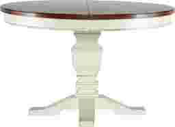 Bring the refreshing look of country styling into your home with the California Cottage pedestal table. The white pedestal base provides a wonderful contrast to the fruitwood top with cherry veneers. The antique white base has a rubbed appearance that enhances the charming vintage look. This 48" round table top extends to 66" with an 18" butterfly leaf.