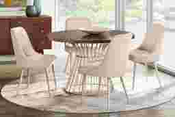 The vibrant colors and graceful lines of the Calisi dining table invite sunshine into your space no matter the weather. This piece offers a 48" round table with a wood top in a rich brown color. The metal pedestal base features a sculptural cage design in a gold finish, softly reflecting light and letting it pass through freely for a stunning, airy effect.