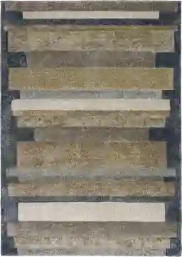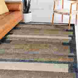 Effortless balance takes shape with calm, modern rhythm as the Calista rug layers in bands of color that bring structure and texture. With a softly worn finish, this piece showcases wide horizontal blocks in light blue, slate, taupe and ivory on a navy-blue background for a grounded, design-forward statement.