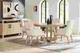 Boasting a rich blend art deco elements with minimalist flair, the Callen Way dining table offers a chic, contemporary centerpiece for mealtime. Crafted of hardwood solids and knotty oak veneers, this piece features a trestle-inspired base with a thick, round top. The table's buttery beige color compliments the rounded corners and edges for a perfect final look.