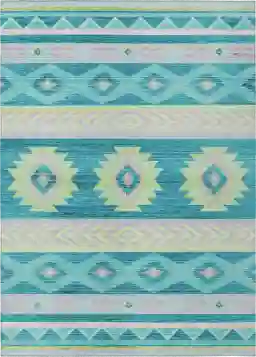 This rug is engineered for versatility and is UV stabilized, meaning the vibrant blue and geometric patterns are treated to resist fading from sun exposure. It is highly suitable for indoor spaces or covered outdoor areas like a screened-in porch or lanai. For coastal or humid climates, the synthetic polyester construction is also beneficial as it does not harbor moisture like natural fibers.