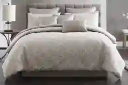 Calvent 9 pc bedding ensemble represents the best of todays contemporary styling. This versatile ensemble features a jacquard print in a sophisticated muted silver hue. Decorative pillows and shams coordinate with the all over comforter for everything you'll need to create the perfect room. Create your perfect space from contemporary to traditional with this beautiful and timeless bedding ensemble. Customer assembly required.