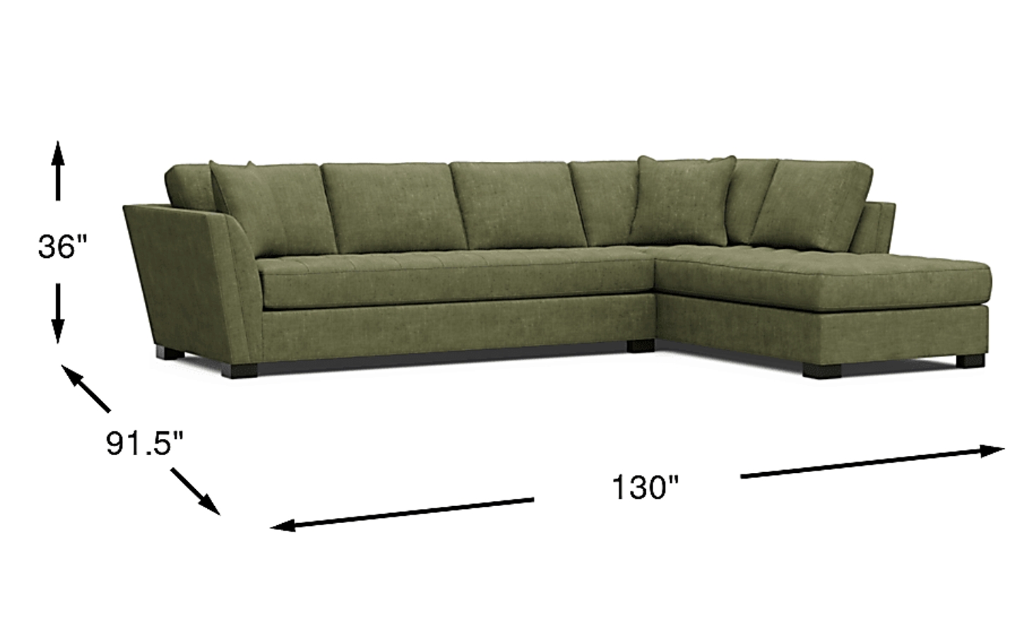 A versatile, stylish, and exceptional piece of furniture, the Calvin Heights XL sectional from Cindy Crawford Home brings a classic contemporary feel that has just the right amount of upscale elegance. Covered in rich chenille fabric that offers comfortable, deep seating for you and your guests, the chic avocado color lends fantastic appeal. Perfect for larger spaces, this expansive sectional can comfortably seat your whole family and easily turns your living area or den into the perfect place to mingle with guests and friends. Quality constructed on a hardwood frame for strength and stability, the sinuous wire seating system provides additional support for an enduring and solid foundation. Premium design features such as welting details, track arms, and elegant tufting on the bench-style seat cushions maintain a tailored silhouette and afford a beautiful appearance. Coordinating accent pillows are included. Upholstery: 100% Polyester.