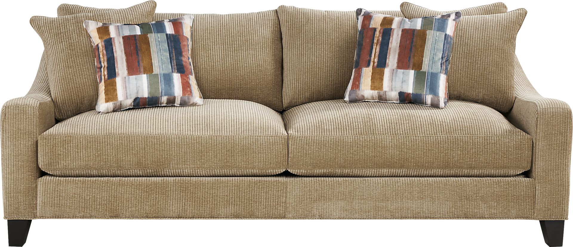 Cultivating a comfortable elegance with its ideal balance of refinement and charm, the Cambria sofa from Cindy Crawford Home showcases a fresh perspective on traditional-inspired style. Upholstered in rich corduroy chenille in a warm gold color, this contemporary piece's track arms sweep low from pillowy back cushions, and the seat cushions between can be removed for easy cleaning. This sofa is perched on tapered legs in a dark finish for contrast, and matching accent pillows are included to complete the look. Upholstery: 100% Polyester.