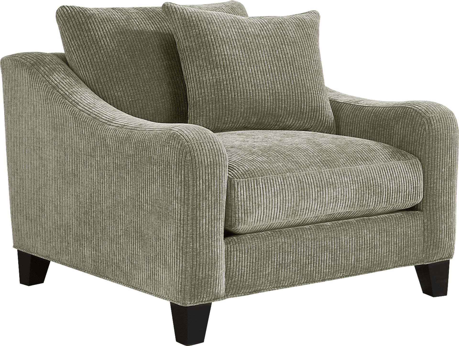 Cultivating a comfortable elegance with its ideal balance of refinement and charm, the Cambria chair from Cindy Crawford Home showcases a fresh perspective on traditional-inspired style. Upholstered in rich corduroy chenille in a vibrant sage color, this contemporary piece's track arms sweep low from a pillowy back cushion, and the seat cushion between can be removed for easy cleaning. This seat is perched on tapered legs in a dark finish for contrast, and a matching accent pillow is included to complete the look. Upholstery: 100% Polyester.