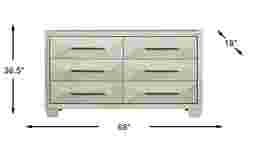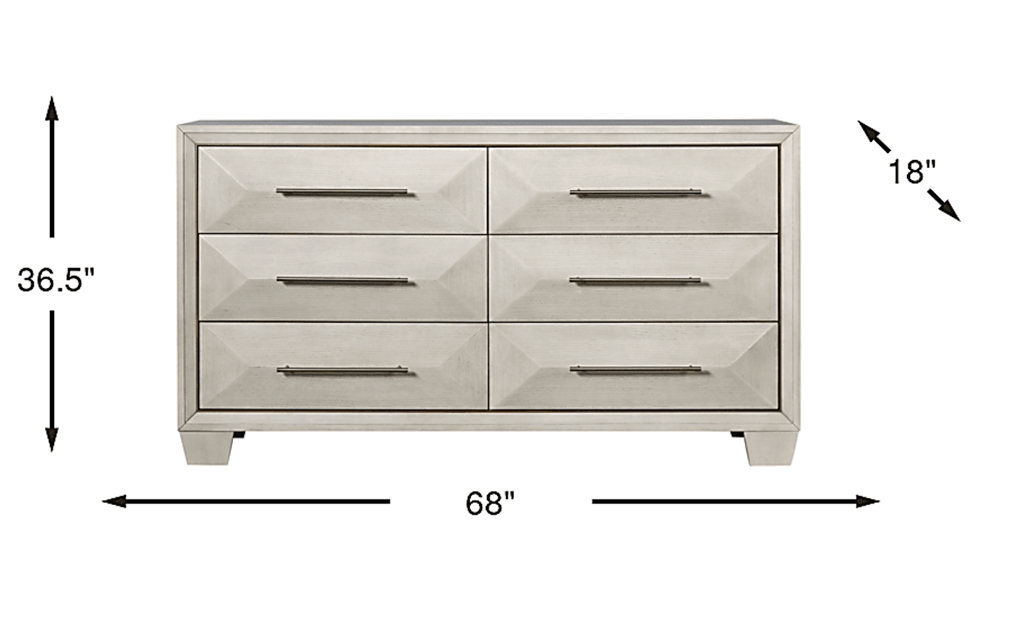 Unique contemporary style with a high end look, the Cambrian Court dresser offers a sophisticated bedroom storage solution. Crafted of poplar and wood solids with white ash veneers in an ash white finish, this six drawer dresser utilizes premium English and French dovetail drawer construction. Raised faceted panels on each drawer front creates a jewelry-inspired look, while gold finished trim and bar pulls add delicate contemporary accents.