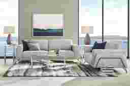 Commanding attention with ease, the Camelot loveseat embodies modern sophistication at its finest. Featuring a low-profile silhouette draped in sumptuous top grain leather where the body touches, this piece strikes the perfect balance between refinement and comfort. Framed by sleek track arms and polished metal legs, the look's tailored stitching lends a crisp, contemporary edge. The upholstery's dove gray color sets a versatile foundation that complements both bold accents and subtle touches, resulting in a loveseat that captures timeless mid-century elegance, reimagined for today. Top grain leather where the body touches and polyurethane fabric sides and backs.