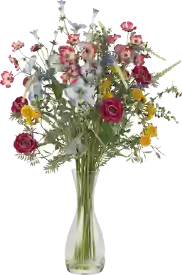 Yes, this silk floral arrangement is designed with high-quality materials to provide a lush, lifelike appearance. It features a 10-inch glass vase filled with "faux water"—a clear resin that provides the aesthetic of fresh water without the maintenance or risk of spills. The eclectic mix of colorful blooms makes it a sophisticated, permanent decorative accent for professional environments or home workspaces.