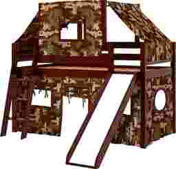 Watch as your little one's eyes light up when you present them with the ultimate childhood fantasy. The Camo Cabin loft bed is every child's dream come true, thanks to a fun tent over the upper twin sized lofted bed and a lower level playhouse with an attached slide. Rendered in a rich brown cherry finish with camouflage fabric, this delightful bed's charm is in its attention to detail.