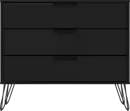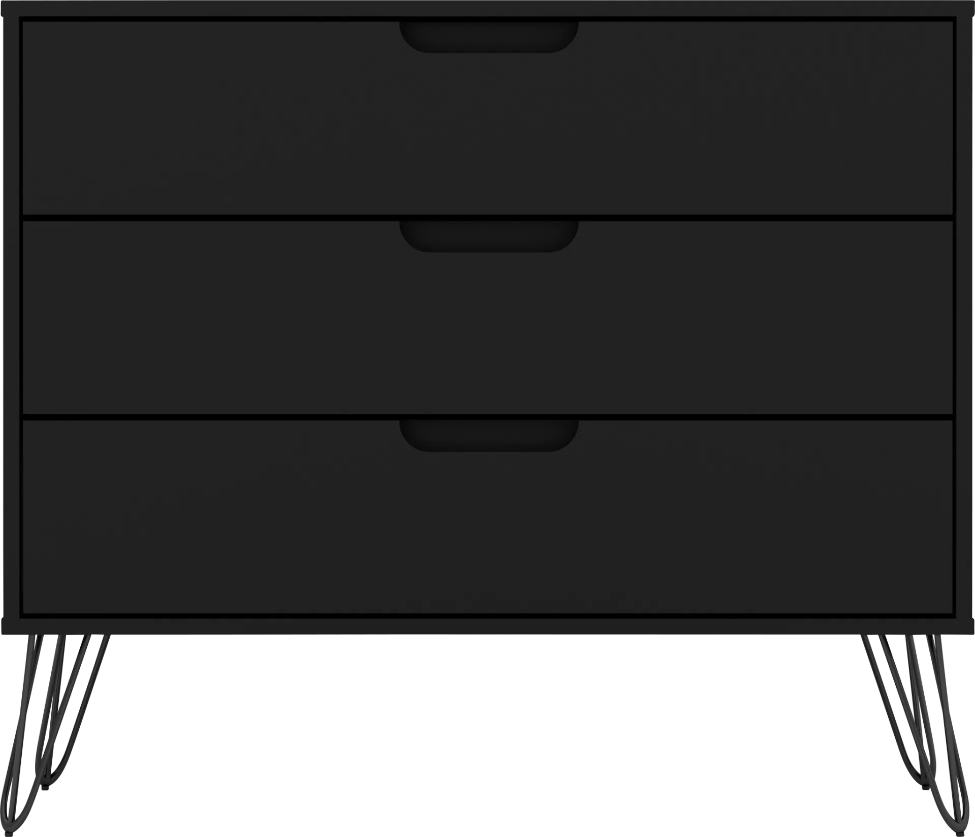 This dresser is designed with a clear Mid-century modern aesthetic. The combination of the clean-lined black finish and the industrial-inspired metal hairpin legs makes it a versatile focal point. It pairs beautifully with contemporary, retro, or minimalist decor, especially when styled with metallic accents or neutral-toned bedding.