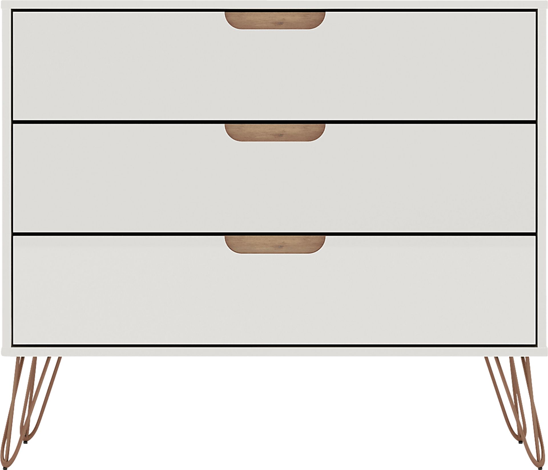 The Camomile VI off-white dresser is the perfect accompaniment to any bedroom space, with ample storage and minimalistic Mid-century modern style. Cutout handles keep the piece feeling fresh with three drawers made easy for stowing away clothing, personal items, and beyond. A display top allows for sharing favorite framed family photos, travel trinkets, perfume trays, or a decorative lamp. Set it under a mirror or painting to complete your space with this instant bedroom focal point. Customer assembly is required.