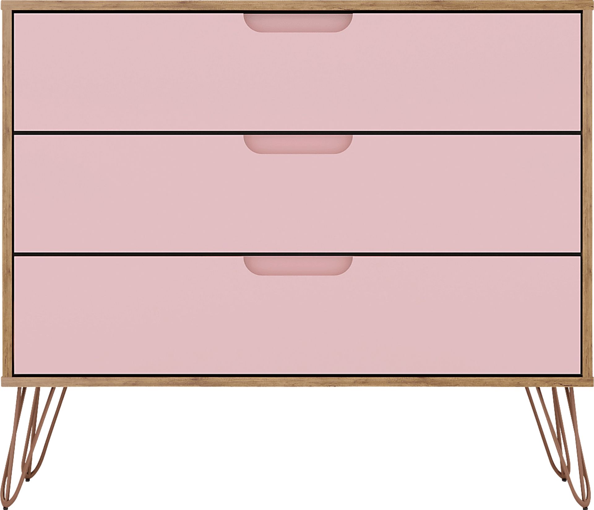 The Camomile VI pink dresser is the perfect accompaniment to any bedroom space, with ample storage and minimalistic Mid-century modern style. Cutout handles keep the piece feeling fresh with three drawers made easy for stowing away clothing, personal items, and beyond. A display top allows for sharing favorite framed family photos, travel trinkets, perfume trays, or a decorative lamp. Set it under a mirror or painting to complete your space with this instant bedroom focal point. Customer assembly is required.