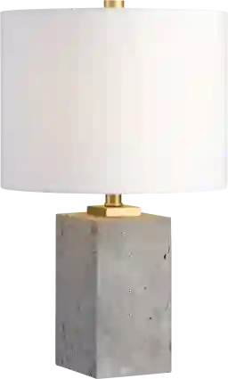 The Campo Bello table lamp has a thick block of porous, lightly stained concrete, accented with brushed gold painted details perfect for timeless fashion. The round hardback drum shade is a white linen fabric. Customer assembly required.