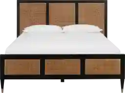 The headboard features high-quality cane inlays, a material prized in "jungle-chic" and boho-modern design for its natural strength and flexibility. The cane is securely integrated into the panel frame, ensuring it can withstand everyday use while maintaining its textured aesthetic. To preserve the weave's integrity, we recommend placing the bed away from direct heat sources which can cause natural fibers to become brittle over time.