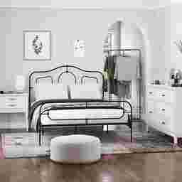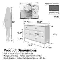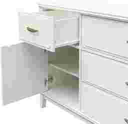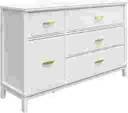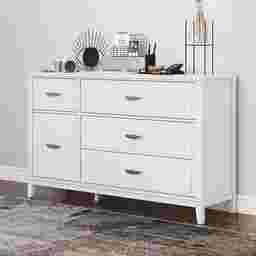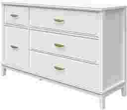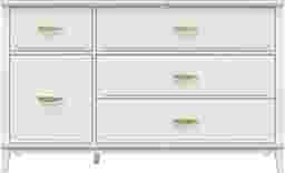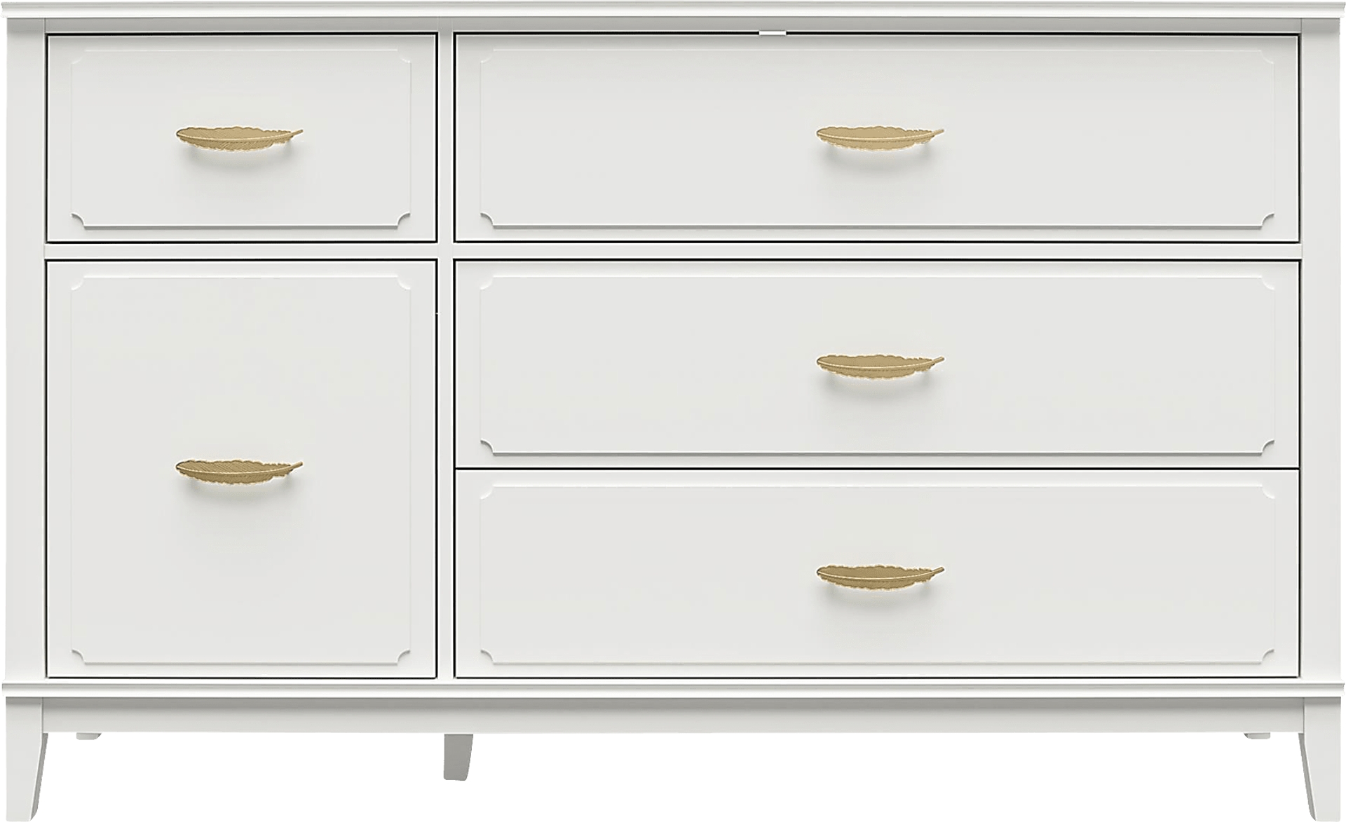 Can we just say that we are obsessed with every little detail of the Canberra dresser From the glamorous gold feather shaped drawer pulls, to the vintage decorative framed drawer fronts, this chic collection brings a soft and inviting eclectic charm to any room. Designed with small spaces and versatility in mind, the Canberra dresser is not only a spectacular addition to the bedroom but transforms into a storage lovers dream when used in an entryway or dining room. Engineered and finished on all sides from durable painted MDF, this dresser is as solid as it is stylish with optimal storage combinations behind three wide drawers, one narrow, and one cabinet with built-in adjustable shelving. Customer assembly required.
