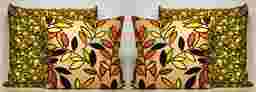 The Candy Wrap toss pillows' unexpected combination of patterns and colors allow you to have fun with your decorating style, bringing a feeling of lightness to the room. This set of four includes a mix of two stylish pillow designs in different sizes. Two 20 inch square pillows feature a fun candy pattern rendered in grasshopper green, brown sugar and lemon drop yellow with a chocolate swirl pattern. Two 17 inch square pillows feature a modern leaf pattern in coordinating shades of grasshopper green, tangerine, lemon drop yellow, mauve-plum and chocolate on a tan backdrop. Each features a removable sham with a zipper bottom. Candy Wrap Toss Pillows