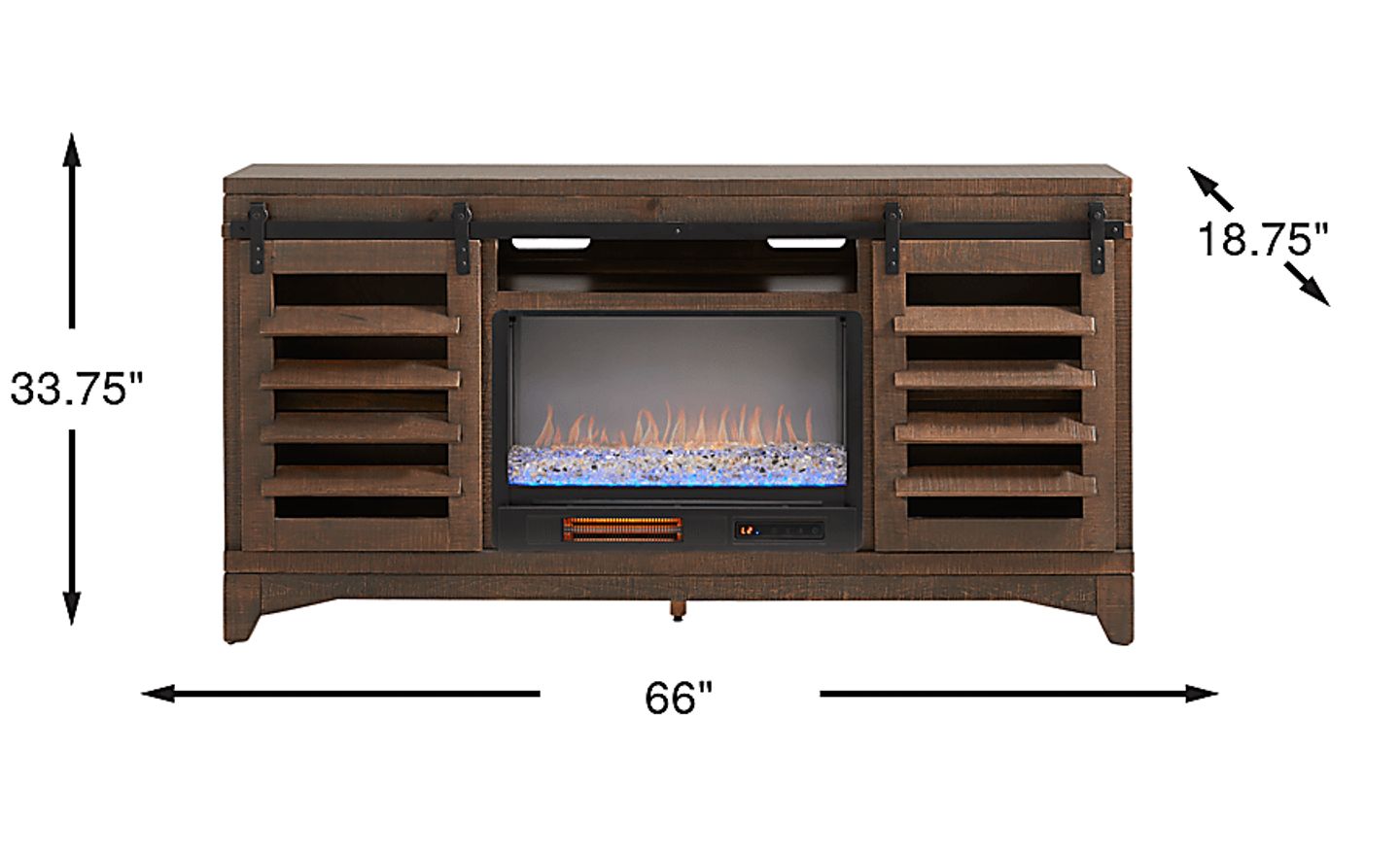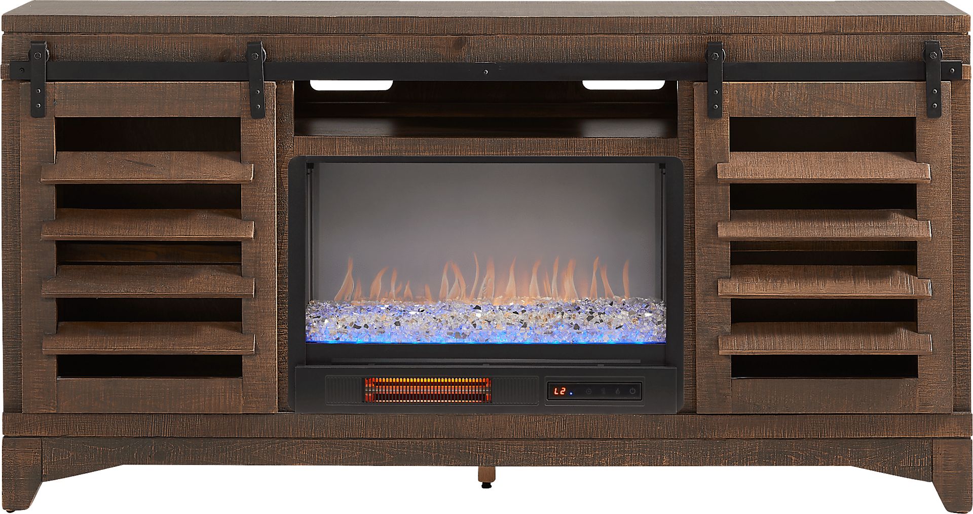 Like a cozy family library evoking thoughtful, inviting and welcoming warmth, the Canoe Creek collection's charming details and clever storage marries form and function with style. This transitional console comes in a rich brown finish and a handsome rectangular frame that delivers a timeless, grounded look. A sleek black metal rail lines the top to guide two slatted doors to the center, revealing spacious shelving for your entertainment essentials. The open center shelf offers a clutter-free setup with rear wire management holes, while the energy-saving LED firebox with remote controlled heat and ambient lighting showcases innovative flame effects on opulent crystals with four color-changing options.