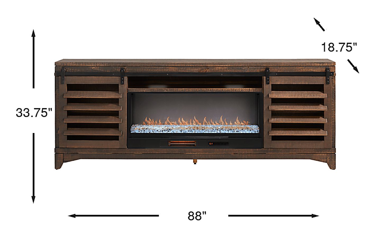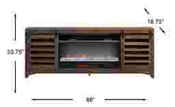 Like a cozy family library evoking thoughtful, inviting and welcoming warmth, the Canoe Creek collection's charming details and clever storage marries form and function with style. This transitional console comes in a rich brown finish and a handsome rectangular frame that delivers a timeless, grounded look. A sleek black metal rail lines the top to guide two slatted doors to the center, revealing spacious shelving for your entertainment essentials. The open center shelf offers a clutter-free setup with rear wire management holes, while the energy-saving LED firebox with remote controlled heat and ambient lighting showcases innovative flame effects on opulent crystals with four color-changing options.