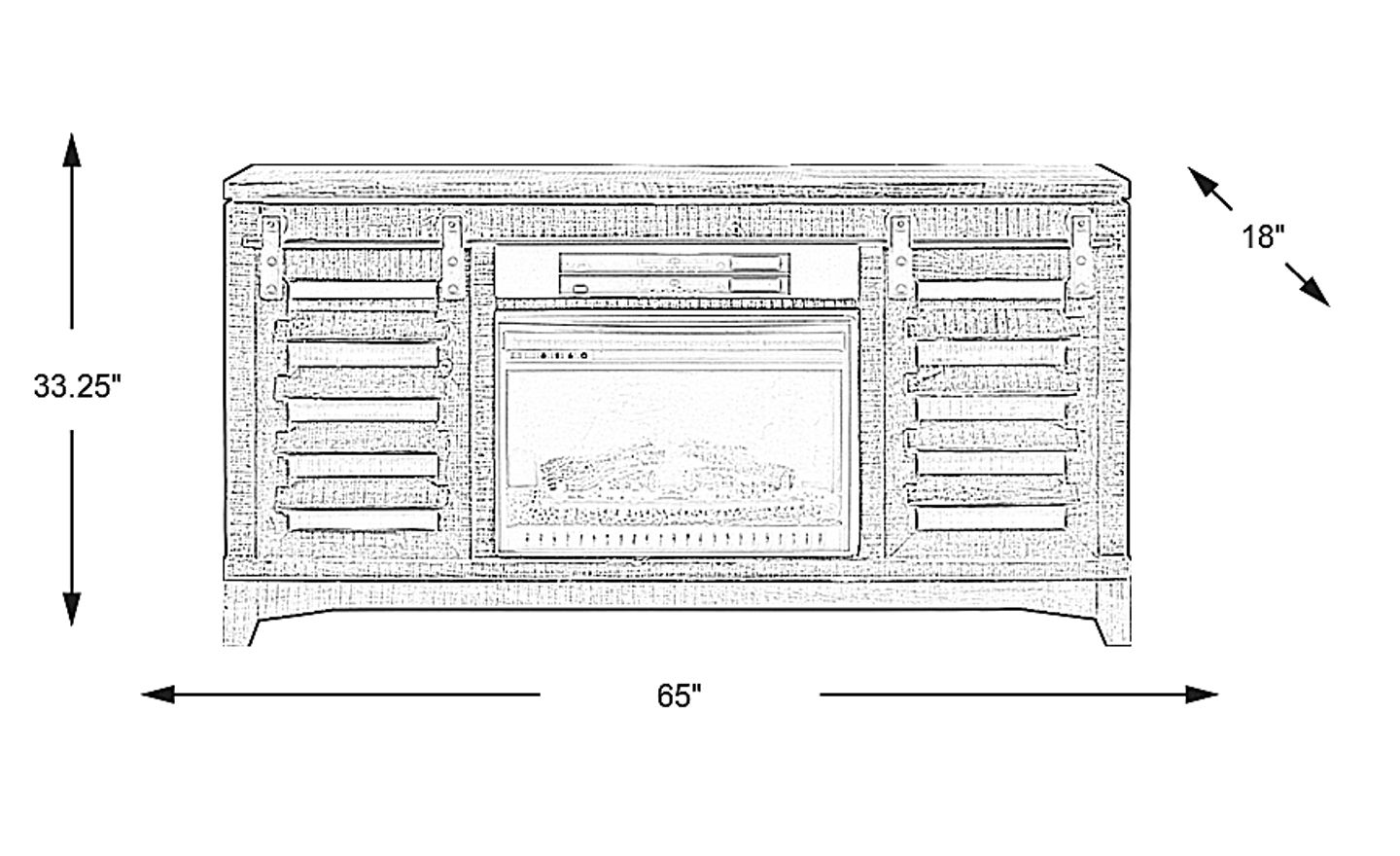 Crafted of pine solids and cedar veneers in a neutral pebble finish, the 65 inch Canoe Creek II console offers an industrial chic media storage solution. Featuring a slatted sliding door front and four drawers this console has all of your storage needs covered. Pass through holes on the back panel keep wires neatly corralled. Metal rails and hardware in a gunmetal finish reinforce the on-trend industrial aesthetic. The electric fireplace features innovative flame effects on bricks and logs for added depth and 3D realism. A convenient remote control adjusts the flame and glow levels and includes a built-in timer (from 30 minutes to 60 hours). The adjustable thermostat ranges from 62 degrees to 82 degrees.