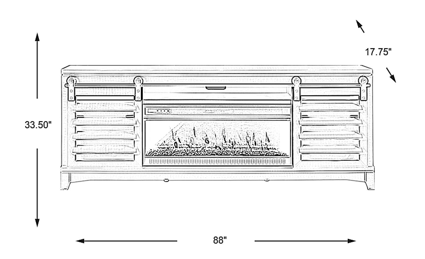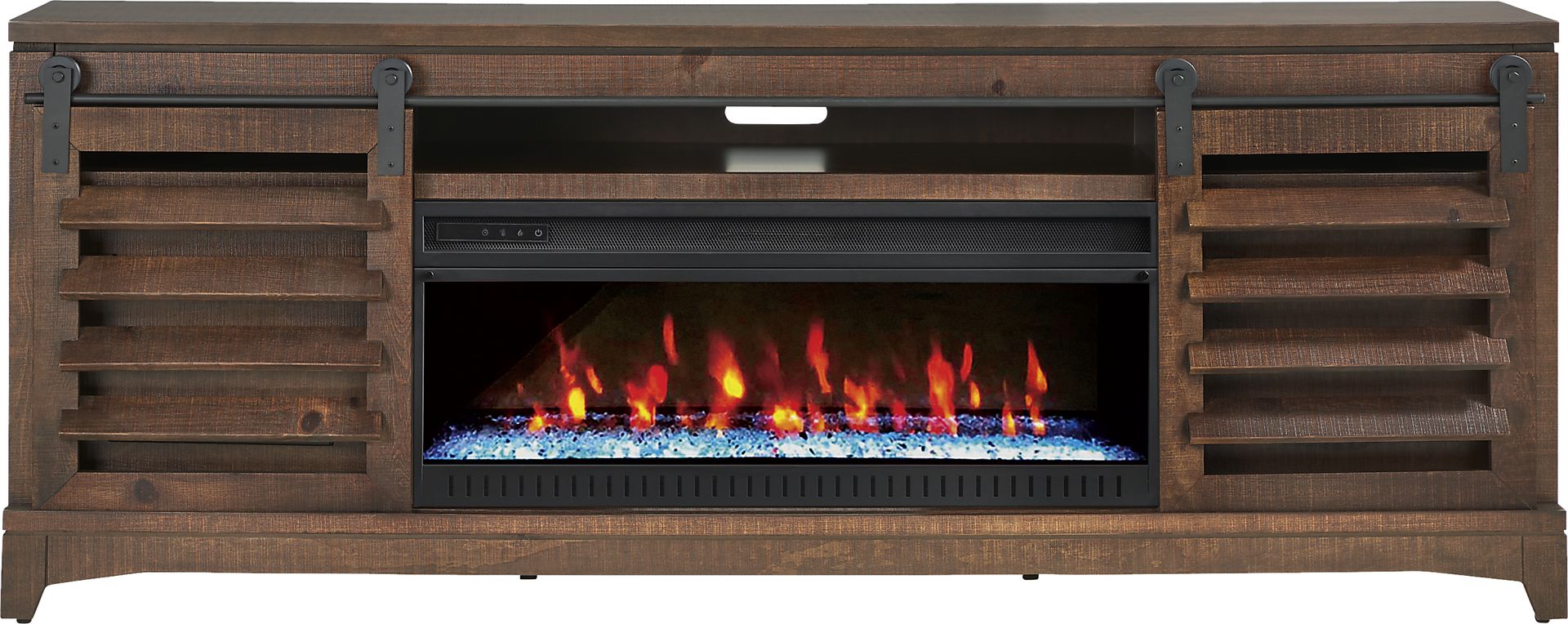 The down-home details of the Canoe Creek console add a functional touch of farmhouse fun to the living room. This tobacco brown rustic piece embodies the French country ideal with whimsical sliding barn doors and an exaggerated wood shutter design to conceal the two sets of side drawers. The vintage-style details of the console are enhanced by modern features, including wire management holes in the back for electronics as well as a modern electric fireplace. Ambient lighting creates added depth with four color changing options across a gorgeous display of LED lights. A convenient remote controls glow levels, heat and includes a built-in timer. Metal hardware in a dark gunmetal finish completes the earthy aesthetic.