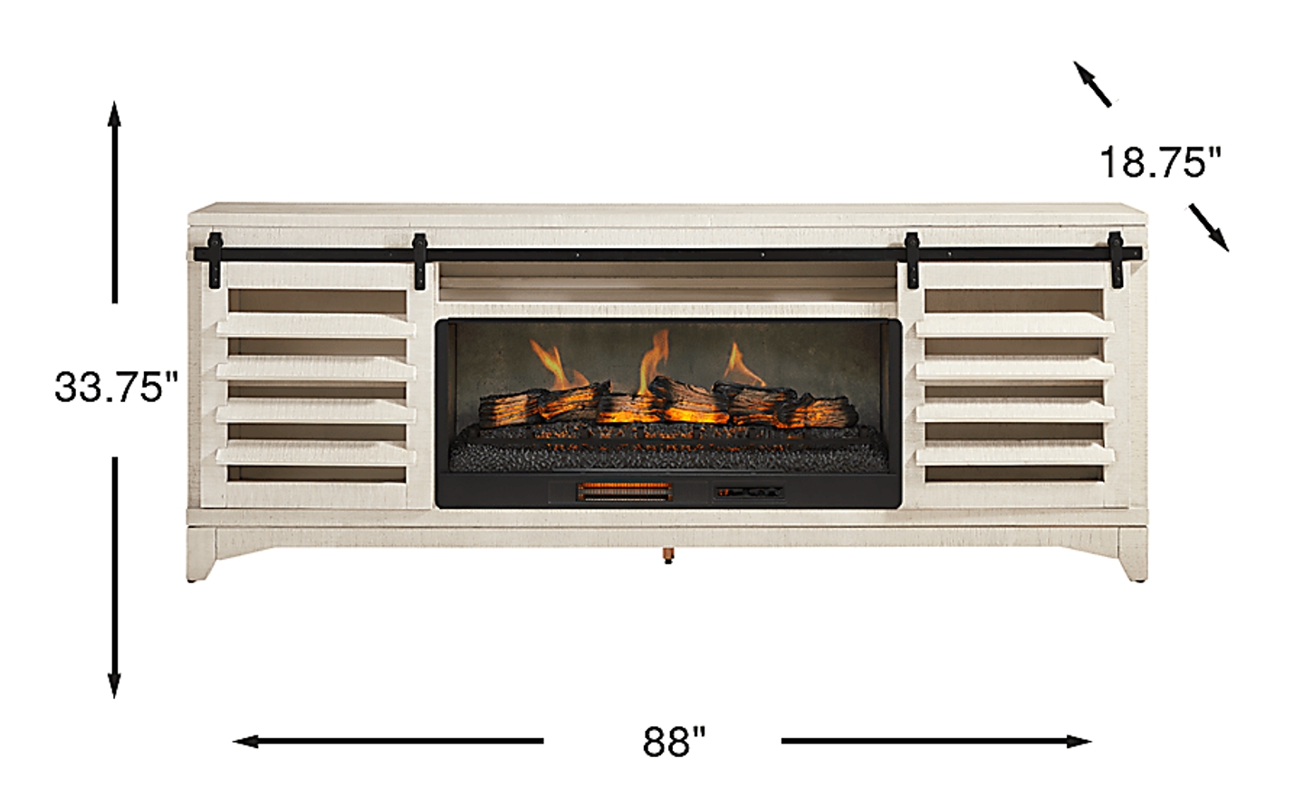Like a cozy family library evoking thoughtful, inviting and welcoming warmth, the Canoe Creek collection's charming details and clever storage marries form and function with style. This transitional console comes in a white finish and a handsome rectangular frame that delivers a timeless, grounded look. A sleek black metal rail lines the top to guide two slatted doors to the center, revealing spacious shelving for your entertainment essentials. The open center shelf offers a clutter-free setup with rear wire management holes, while the electric fireplace below showcases innovative flame effects on bricks and logs for added depth and 3D realism. A handy remote control allows you to customize the flame, glow levels and temperature so you can enjoy a cozy ambiance year-round.