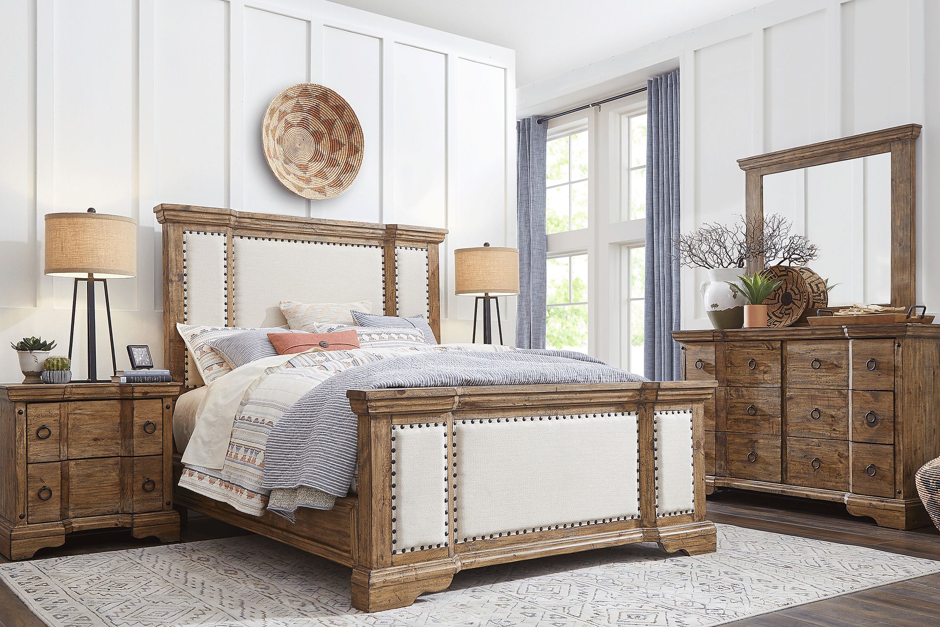 Elevate your sleeping set up with the stylishly designed Canyon City upholstered bedroom. Crafted of Brazilian pine solids in a beautiful camel finish that accentuates the natural wood grain, this collection makes for an excellent addition to your bedroom. The upholstered headboard features a soft fabric in a contrasting white color with nailhead detailing to give the piece a rustic look. A dresser and mirror combo and two nightstands complete this room. Mattress and foundation (if required) sold separately. Bed shown is queen size.