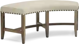 This bench achieves its chic rustic look through a combination of organic textures and refined details. The distressed tan finish on the pine veneer legs provides a weathered, time-worn appeal, while the woven polyester fabric in a soft cream color adds warmth. The look is completed with a nailhead border, a classic design element that adds a distinguished, handcrafted touch to farmhouse or transitional dining spaces.