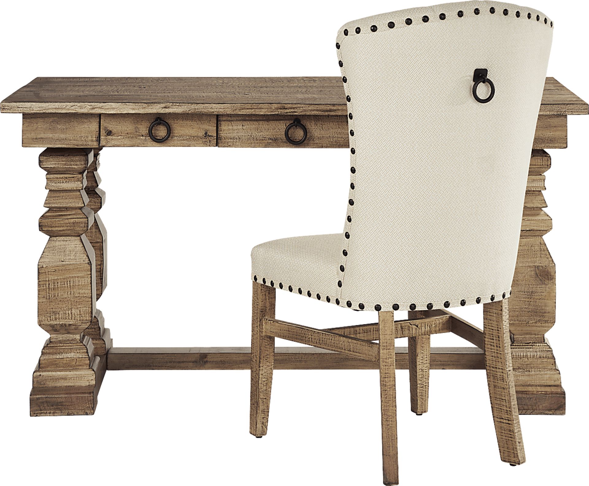 Enhance your workspace with the rustic-traditional Canyon City desk and chair. Crafted of pine solids and veneers, the desk is rendered in a distressed natural finish with intricate weathering details. Its handsomely designed legs heighten visual interest, displaying curves and carvings from top to bottom. Upholstered with polyester fabric, the included chair boasts an exquisite woven look in a soft cream color. Button tufting on the seat back along with nailhead accents on the sides create a distinguished appearance. Burnished ring pulls on the back of the chair and on each of the desk drawers add the finishing touch to top off its ranch-style impression.