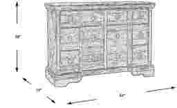 Harnessing rustic elements, the Canyon City buffet fosters a memorably stylish design. Crafted of pine solids and veneers, this piece is rendered in a distressed tan finish with intricate weathering details. Burnished ring pulls emphasize its rustic, ranch style. Built for ample storage, this buffet's unique construction includes two drawers and two doors which open to reveal space to stow away glasses, trays and more with adjustable shelving.