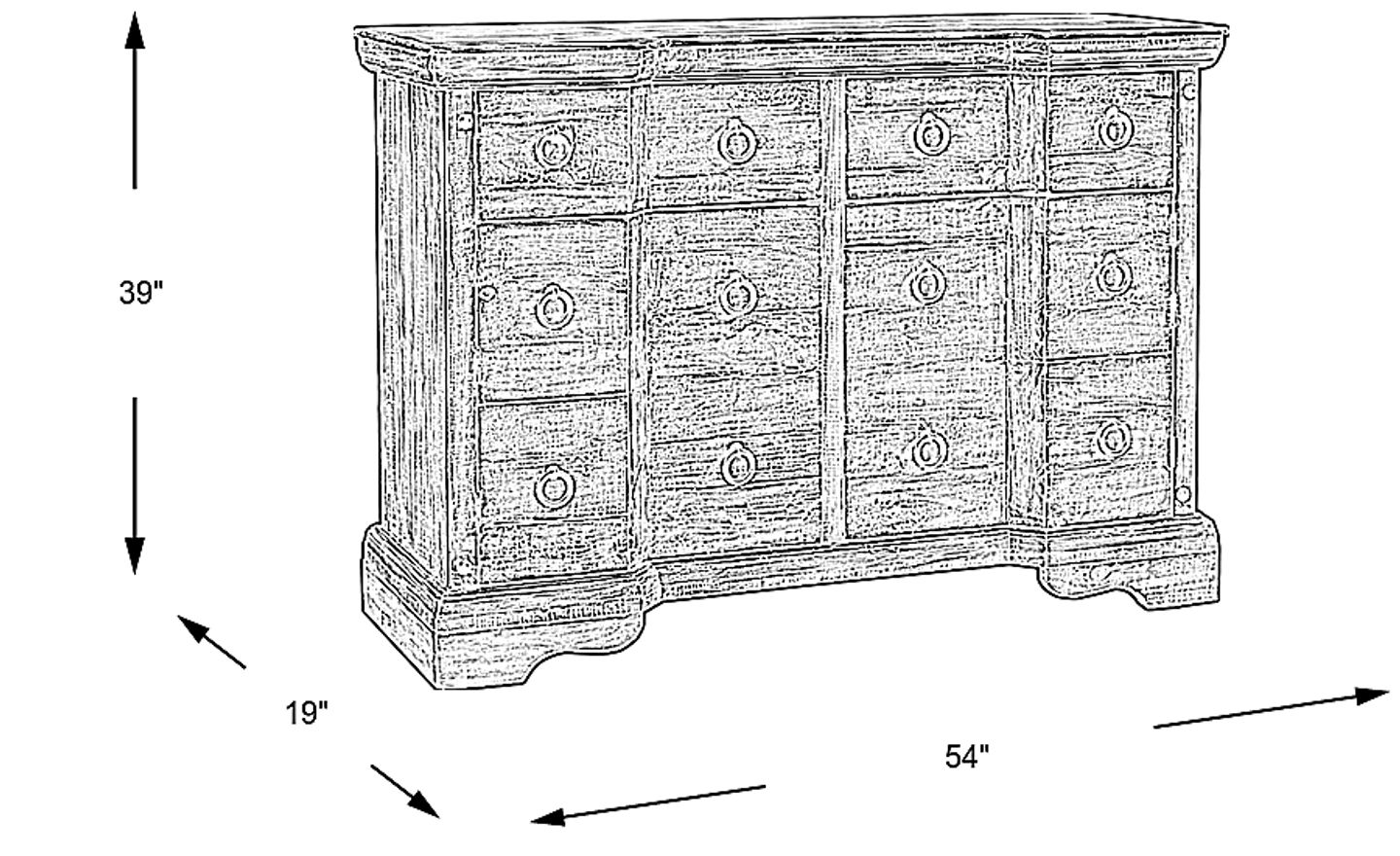 Measuring 54" wide and 19" deep, this buffet is designed as a standard-scale server that provides significant storage without overwhelming most dining rooms. For optimal room flow, our experts recommend leaving at least 36 inches of clearance between the buffet and your dining table. This ensures enough space for walkways and allows you to fully extend the drawers and open the cabinet doors comfortably.