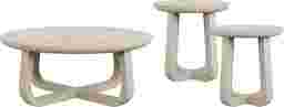 Gather 'round in light and lively style with the inspired Drew & Jonathan Canyon table collection. Contemporary flair and oak veneers in a light gray wash give this round cocktail table and matching end tables a look that's equal parts unique and familiar. The crossed bases create space for storage as well as an interesting stirrup design, and the natural materials and bent shapes evoke unmistakable midcentury character. A stone top on each of the end tables creates an elevated touch to pull the set together.