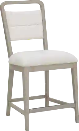 Subtle art deco flair infused with warm, family-friendly appeal is the hallmark of the captivating curves and lines of the Drew & Jonathan Canyon dining room. Exuding contemporary charm, this counter height set is finished in a light gray hue and shaped into organic stirrup-style bends. An open pedestal design showcases the table's tall, interconnected base, and the handsome curved edge on the tabletop invites comfortable, casual enjoyment. Four counter height wood-back chairs mirror the distinctive style with angled, tapered legs and seats upholstered in white fabric.