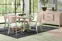 Subtle art deco flair infused with warm, family-friendly appeal is the hallmark of the captivating curves and lines of the Drew & Jonathan Canyon dining room. Exuding contemporary charm, this set is finished in a light gray hue and shaped into organic stirrup-style bends. An open pedestal design showcases the table's interconnected base while the round tabletop invites comfortable, casual enjoyment. Four wood-back side chairs mirror the distinctive style with angled, tapered legs and seats upholstered in white fabric. This dining room is ideal for smaller spaces such as apartments or condos.