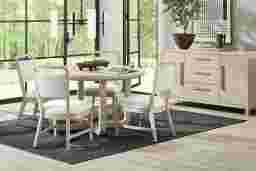 Subtle art deco flair infused with warm, family-friendly appeal is the hallmark of the captivating curves and lines of the Drew & Jonathan Canyon dining room. Exuding contemporary charm, this set is finished in a light gray hue and shaped into organic stirrup-style bends. An open pedestal design showcases the table's interconnected base while the round tabletop invites comfortable, casual enjoyment. Four side chairs mirror the distinctive style with angled, tapered legs complemented by curved backs and seats upholstered in white fabric. This dining room is ideal for smaller spaces such as apartments or condos.
