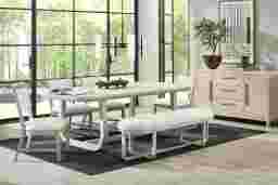 Subtle art deco flair infused with warm, family-friendly appeal is the hallmark of the captivating curves and lines of the Drew & Jonathan Canyon dining room. Exuding contemporary charm, this set is finished in a light gray hue and shaped into organic stirrup-style bends. An open double-pedestal design showcases the table's interconnected base, and the handsome curved edge on the tabletop invites comfortable, casual enjoyment. Four side chairs mirror the distinctive style with angled, tapered legs complemented by curved backs and seats upholstered in white fabric. A matching bench with soft upholstery completes the look.