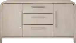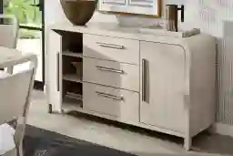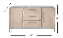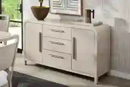 Subtle art deco flair infused with warm, family-friendly appeal is the hallmark of the captivating curves and lines of the Drew & Jonathan Canyon buffet. Exuding contemporary charm, this piece is finished in a light gray hue and shaped into organic stirrup-style bends. Three shelves on either side keep things tidy behind the cabinet doors, and three central drawers maximize the storage space.
