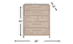 Exuding a calm and meditative ambiance, the Drew & Jonathan Canyon chest's natural elements and curved design presents a warm sophistication for your personal retreat. Constructed with oak veneers in a light gray finish, this contemporary piece features a rounded frame with silver metal pulls, providing a soft holistic look. French dovetail construction in the front and English dovetail in the back with full extension ball-bearing glides secure the support and longevity of all five drawers.