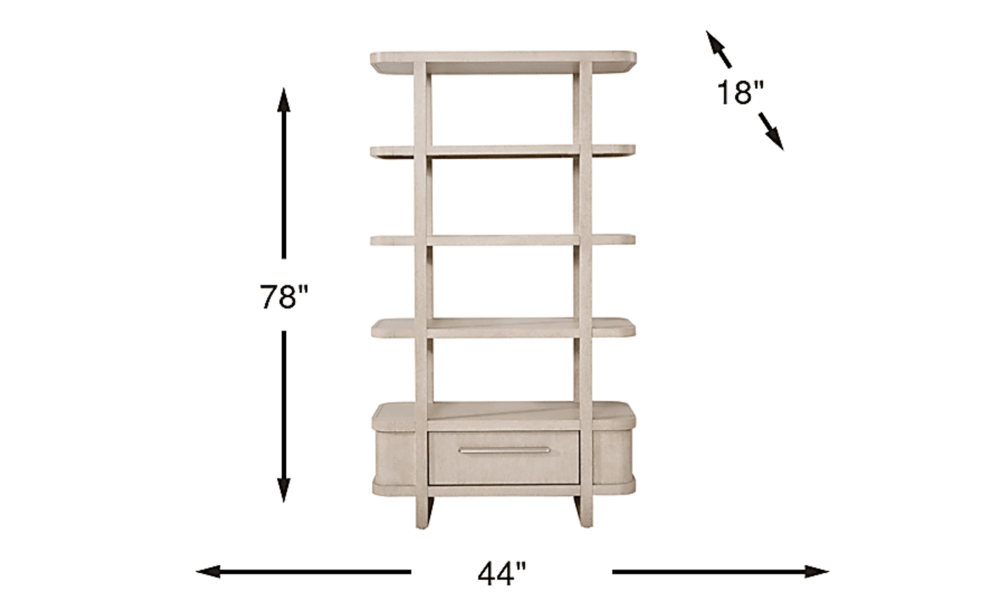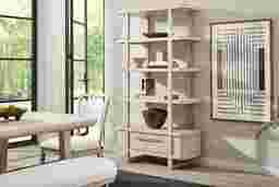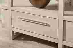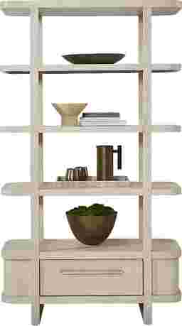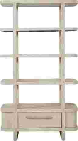 Subtle art deco flair infused with warm, family-friendly appeal is the hallmark of the captivating curves and lines of the Drew & Jonathan Canyon china display. Exuding contemporary charm, this piece is finished in a light gray hue and shaped into organic stirrup-style bends. An open, interconnected design with four wide shelves showcases all your favorite decor, while the bottom drawer adds extra storage.