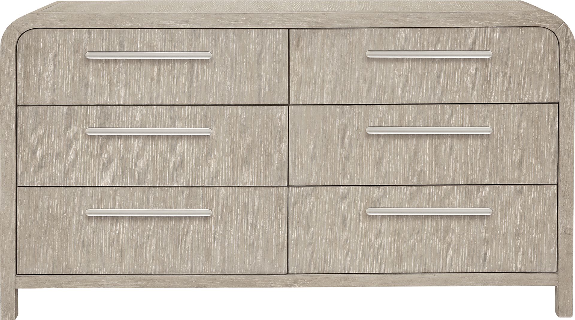 Exuding a calm and meditative ambiance, the Drew & Jonathan Canyon dresser's natural elements and curved design presents a warm sophistication for your personal retreat. Constructed with oak veneers in a light gray finish, this contemporary piece features a rounded frame and silver metal pulls, providing a soft holistic look. French dovetail construction in the front and English dovetail in the back with full extension ball-bearing glides secure the support and longevity of all six drawers.