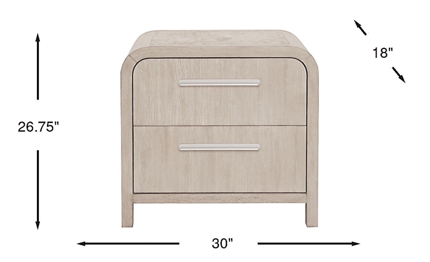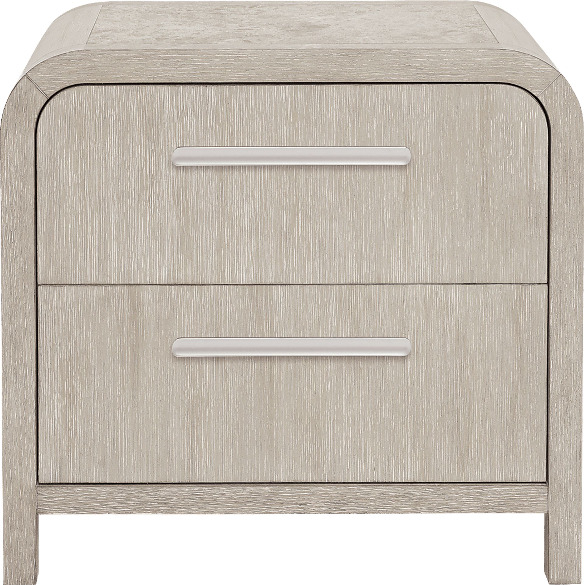 Exuding a calm and meditative ambiance, the Drew & Jonathan Canyon nightstand's natural elements and curved design presents a warm sophistication for your personal retreat. Constructed with oak veneers in a light gray finish, this contemporary piece features a rounded frame and silver metal pulls, providing a soft holistic look. French dovetail construction in the front and English dovetail in the back with full extension ball-bearing glides secure the support and longevity of both drawers. The top of the nightstand features a stone inlay for the perfect final look.