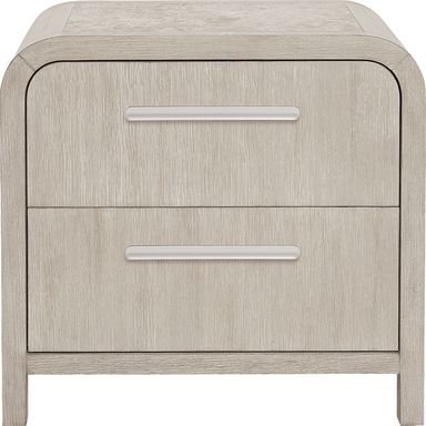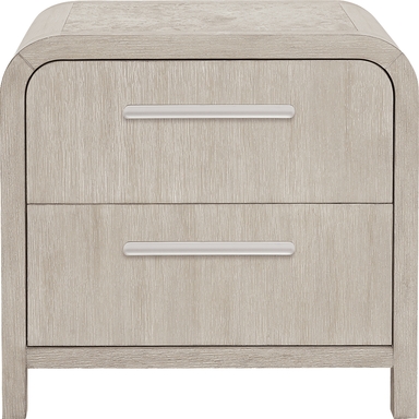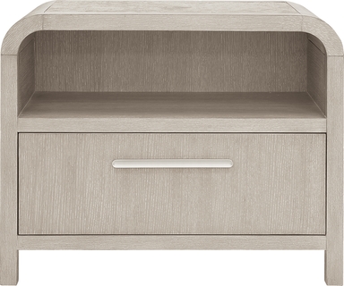 Exuding a calm and meditative ambiance, the Drew & Jonathan Canyon nightstand's natural elements and curved design presents a warm sophistication for your personal retreat. Constructed with oak veneers in a light gray finish, this contemporary piece features a rounded frame and silver metal pull, providing a soft holistic look. The touch LED light in the top shelf is perfect for nighttime reading or showcasing decor. French dovetail construction in the front and English dovetail in the back with full extension ball-bearing glides secure the support and longevity of the drawer. The top of the nightstand features a stone inlay for the perfect final look.